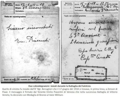 Dalla colombaia di Udine partì invece il volatile che portò tempestivamente le allarmanti notizie dell’avanzata nemica su Caporetto.