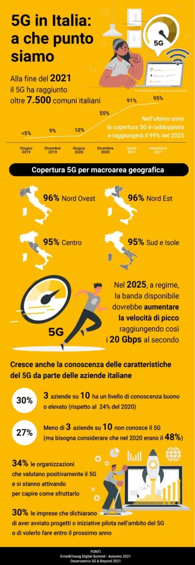 Gli analisti raccontano come a livello mondiale il 75% delle imprese non ha ancora una piena consapevolezza delle potenzialità del 5G. Il fatto che in Italia oltre la metà delle aziende (64%) si stia attivando sul 5G o abbia già iniziato progetti e iniziative pilota offre una fotografia interessante del livello di maturità del Paese. I dati non riguardano solo le grandi imprese. Il 31% delle microimprese è pronto a utilizzare una connessione 5G al posto di internet fisso, mentre il 46% delle PMI intende farne uso per migliorare e innovare i processi aziendali. Anche a livello consumer, il 42% delle famiglie pensa che le reti di nuova generazione garantiranno una connettività più affidabile e costante in casa e in mobilità, con oltre due italiani su 10 (24%) convinto che presto utilizzerà la rete 5G come connessione internet principale per il proprio nucleo familiare (Fonte: Ernst&Young Digital Summit 2021).
