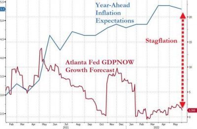 mostra come il crollo dei dati macro degli ultimi dieci giorni abbia portato il tracciatore del Pil in tempo reale della Fed di Atlanta (GDPNow) per il secondo trimestre a scendere dall’1,9% del 27 maggio al’1.3% di oggi. Insomma, la Fed sta di fatto alzando i tassi nel pieno di un processo recessivo ormai in formazione e pronto a schiantarsi contro la riva.