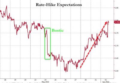 dopo aver rassicurato tutti rispetto a una logica da incidente controllato, parlando a chiare lettere di una possibile pausa del QT già in settembre, il numero uno di Atlanta, Raphael Bostic, ha rispedito in orbita le prezzature di mercato per una marcia a tappe forzate verso la normalizzazione del costo del denaro (9 aumenti nel 2022) dichiarando come le sue parole non siano assolutamente da interpretare come un Fed Put da qui a tre mesi. Boom. E questo terzo grafico
