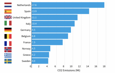 Nella classifica entra anche l’Italia che, per colpa anche della superficie totale di costa maggiore di altri Paesi, si aggiudica il terzo posto della classifica relativa alle emissioni totali (tutte le attività). In questa classifica totale l’Italia emette circa 15 milioni di tonnellate di CO2, mentre l’Olanda al primo posto ne genera 17,6.